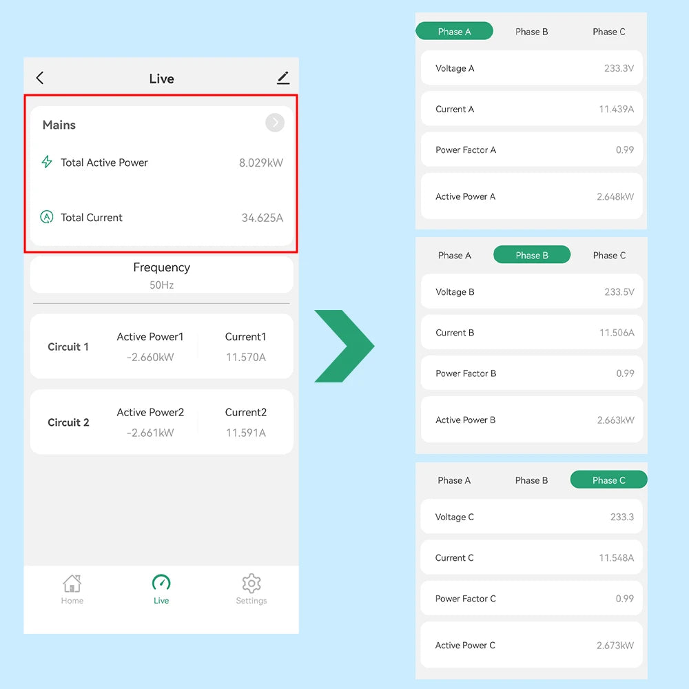 The App displays the voltage, current, active power, and frequency in real time.